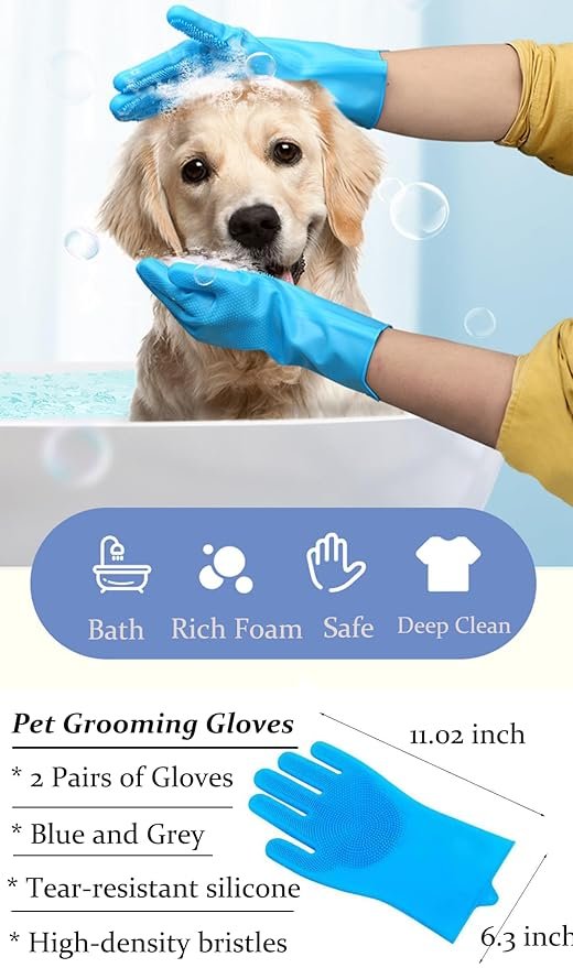 Dog Grooming Gloves and Brush Set — 2 pairs of bath gloves (Blue and Grey); 2 PCS dog washing brush (Blue and Grey); 1 PCS slicker brush for dogs; 2 PCS dog finger toothbrush; A big set of 7-in-1 to…